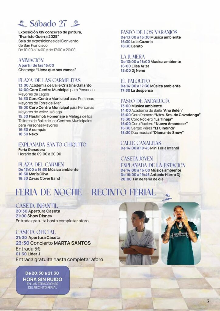 Every night in the main tent in the night feria ground there’s a music act (see poster above). You can get tickets from the tourism office of Velez (Plaza de las Carmelitas) or Torre del Mar.