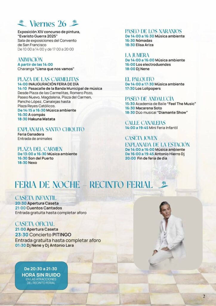 For the main tent acts you may need to buy tickets, ask at the town hall. Here are the main tent acts who are playing live at Velez-Malaga’s 2025 feria: